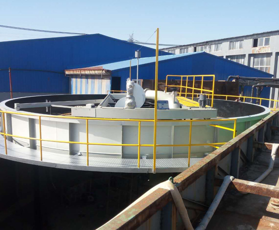 浅层气浮是溶气气浮的一种主要方式。其装置集凝聚、气浮、撇渣、沉淀、刮泥为一体。整体呈圆柱形,结构紧凑,池子较浅。装置主体由五大部分组成:池体、旋转布水机构、溶气释放机构、框架机构、集水机构等。进水口、出水口与浮渣排出口全部集中在池体中央区域内,布水机构、集水机构、溶气释放机构都与框架紧密连接在一起,围绕池体中心转动。