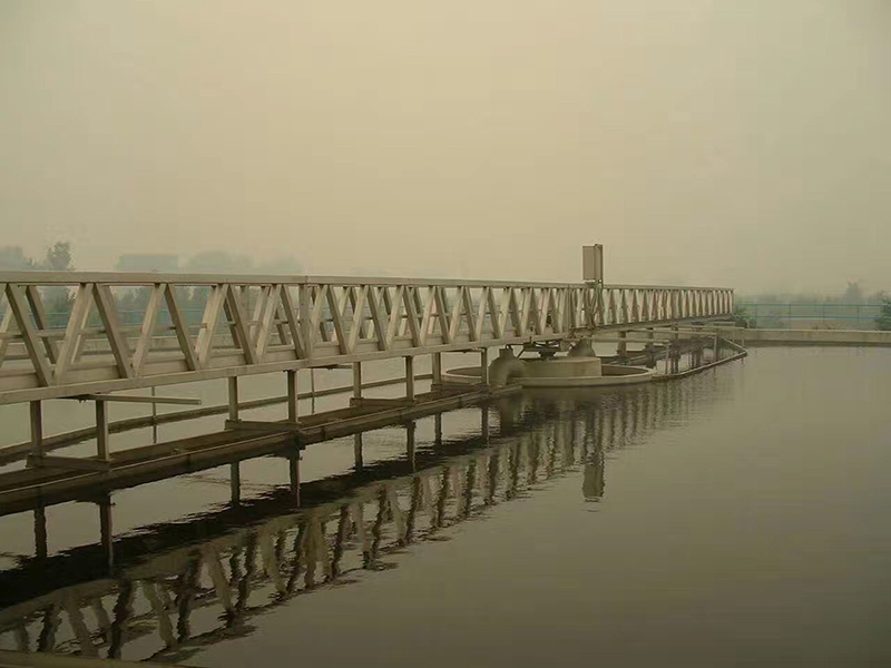 中心支座由固定支撑座、回转轴承和机架组成,可同时承受轴向力、径向力和倾覆力矩。集电装置采用滑环式集电装置,由集电环和电刷架组成。浮潭刮板、浮渣耙板、浮渣漏斗组成排渣机构,能有效地清除水面浮渣。工作桥是连接中心支座和行走端梁的大型部件,其上有走道板和栏杆,钢梁的下面连接刮泥结构,排渣机构等,在行走装置的带动下来完成刮泥,排渣工作。