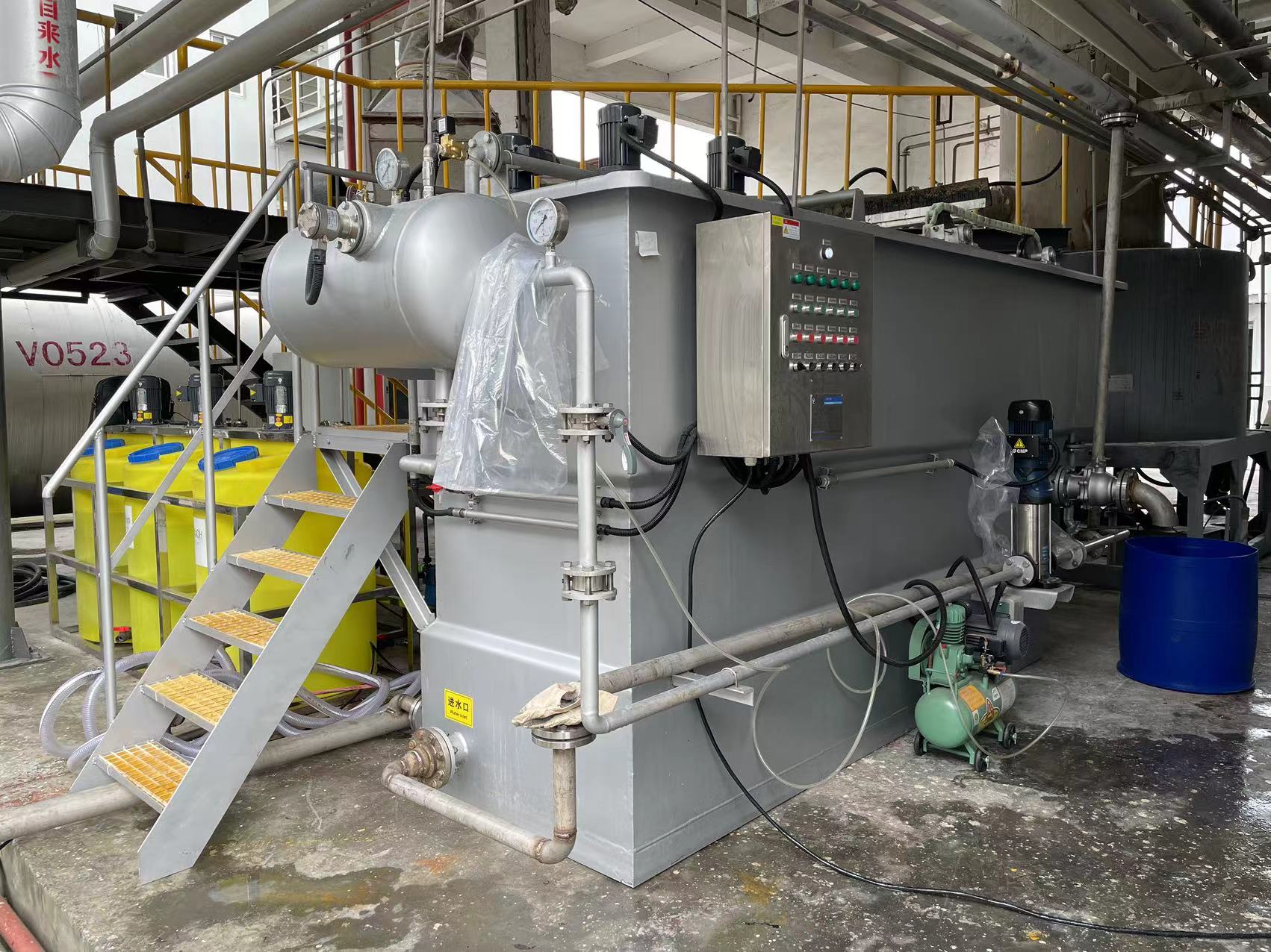 行业应用:树脂材料 项目名称:树脂材料回收项目 产品名称:RDAF高效溶气气浮 水处理量:5m³/h 案例介绍: 杭州电化新材料有限公司成立于2016年4月,是杭州电化集团有限公司的控股子公司,公司位于浙江省杭州市大江东产业集聚区临江高新技术产业园区,注册资本3000万元,占地约3.68万平方米,是一家专业从事生产氯化聚氯乙烯树脂及共混料、特种PVC树脂和氯醚树脂等产品的有限责任公司。 在生产PVC原材料的过程中排放的污水还含有少量PVC细小颗粒,将污水经过pH调节、混凝絮凝后,细小的颗粒汇聚成较大的絮状物,再使用气浮浮选出来进行回收。 |